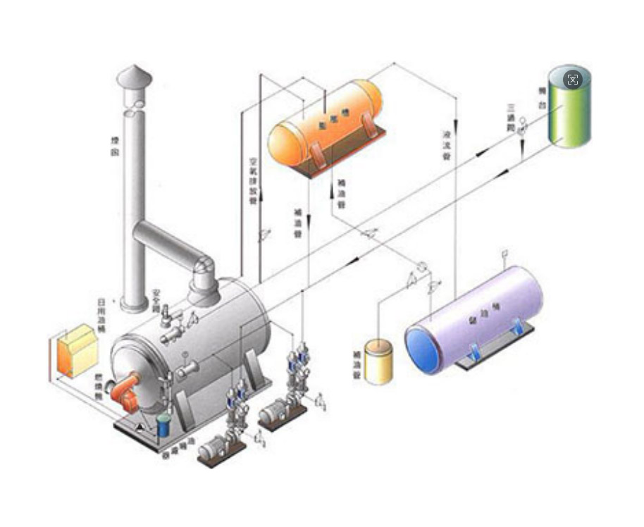 主要由循環(huán)油泵、加熱爐本體、熱用戶(用熱設(shè)備)、油氣分離器及相關(guān)閥門管線構(gòu)成,如儲(chǔ)油槽、膨脹槽、注油泵等也都是不可缺少的輔助管路及設(shè)備。